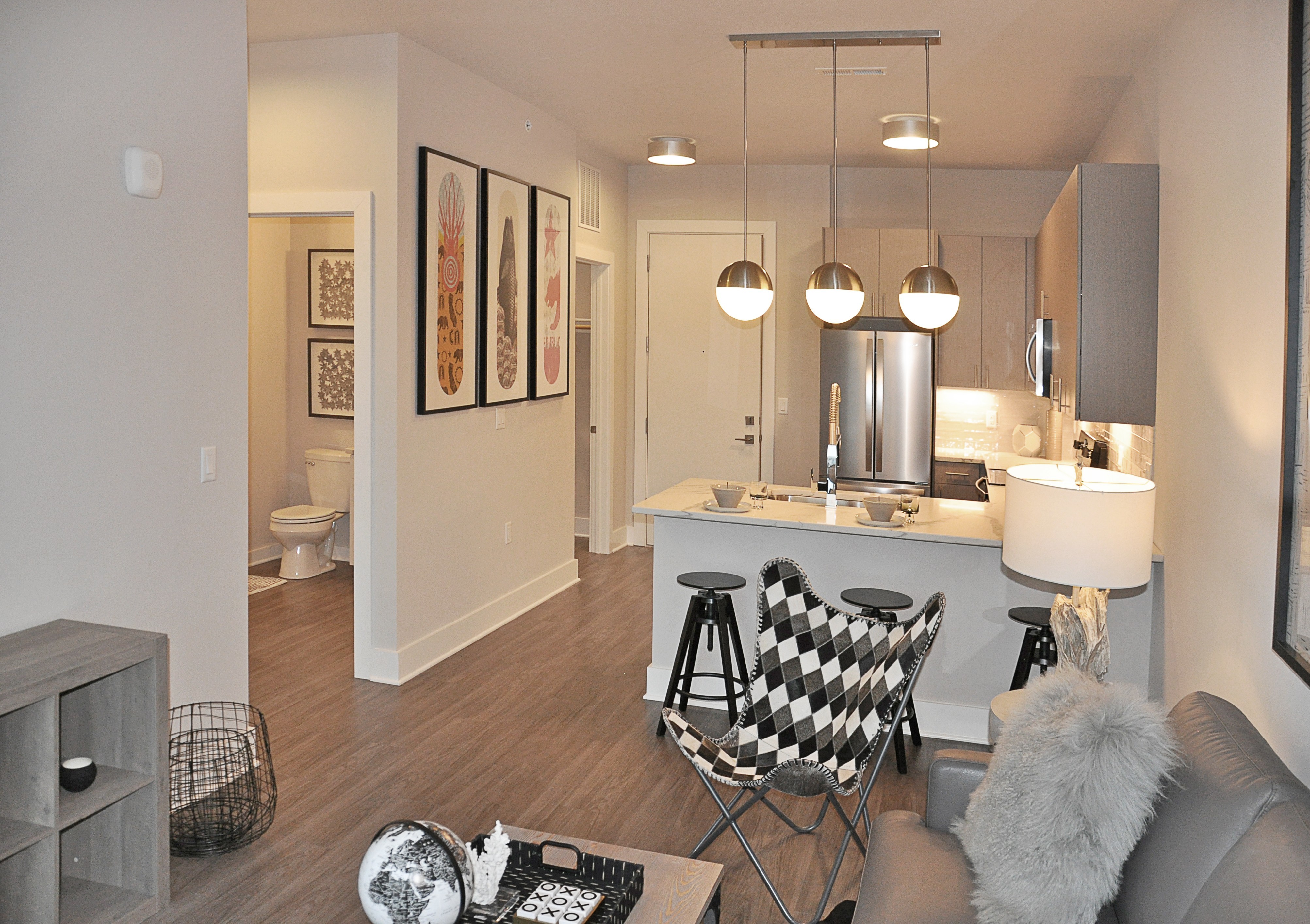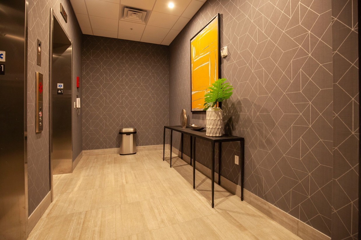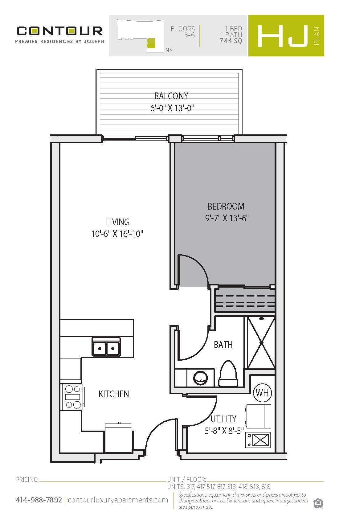 Contour on Prospect - Plan HJ This one bedroom apartment home features a southern exposure and phenomenal lake views on upper floors! A large, wrap-around style kitchen features stainless steel appliances, quartz countertops, ceramic tile backsplash, soft-close cabinetry, and under cabinet lighting. Beautiful pendant lighting illuminates this sleek and modern kitchen. The bedroom closet features double hanging rods to maximize storage space. A large south-facing balcony with floor to ceiling windows lets in great light all day long. Tall 10-foot ceilings make the space feel even brighter and bigger! A convenient utility room is home to a full-size washer/dryer, coat closet and extra storage space. Come tour your new apartment home today!