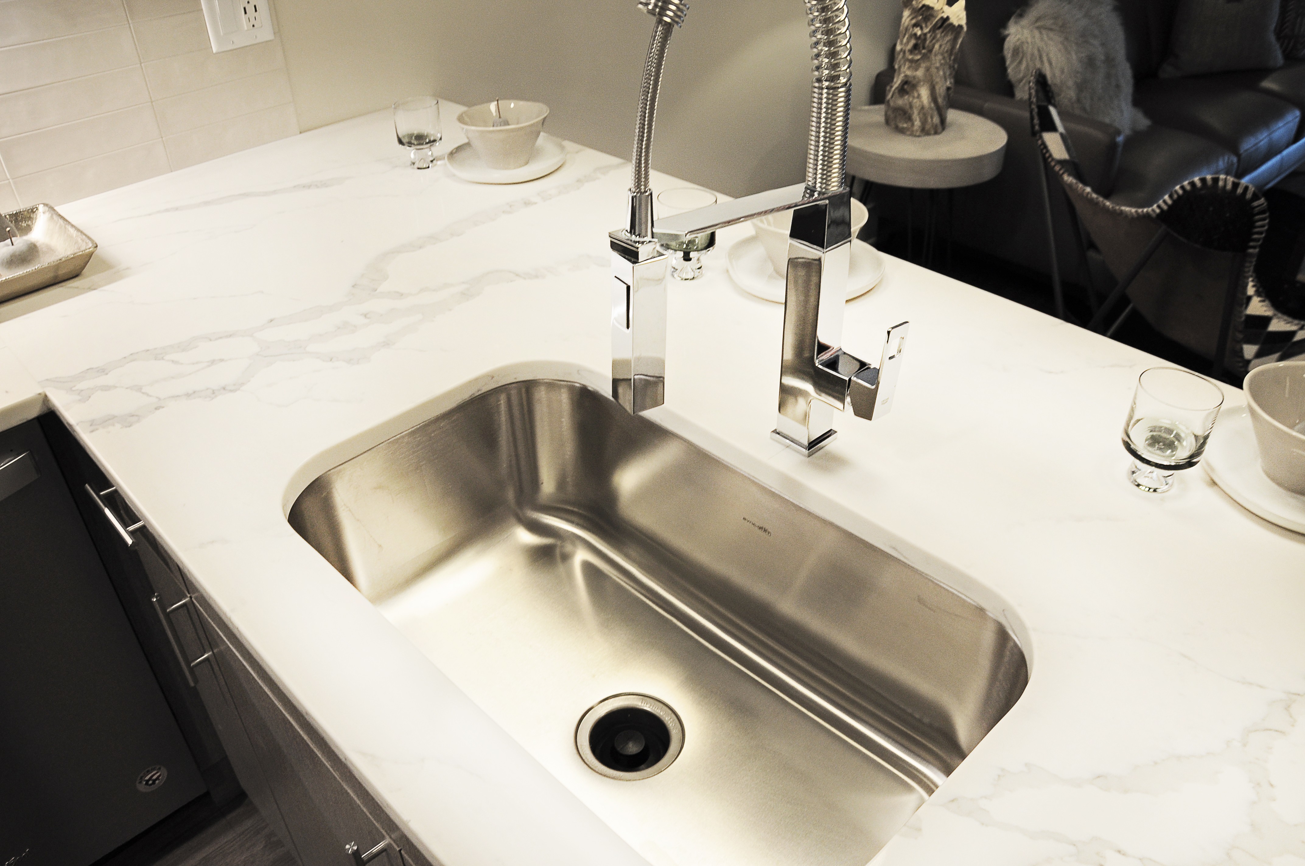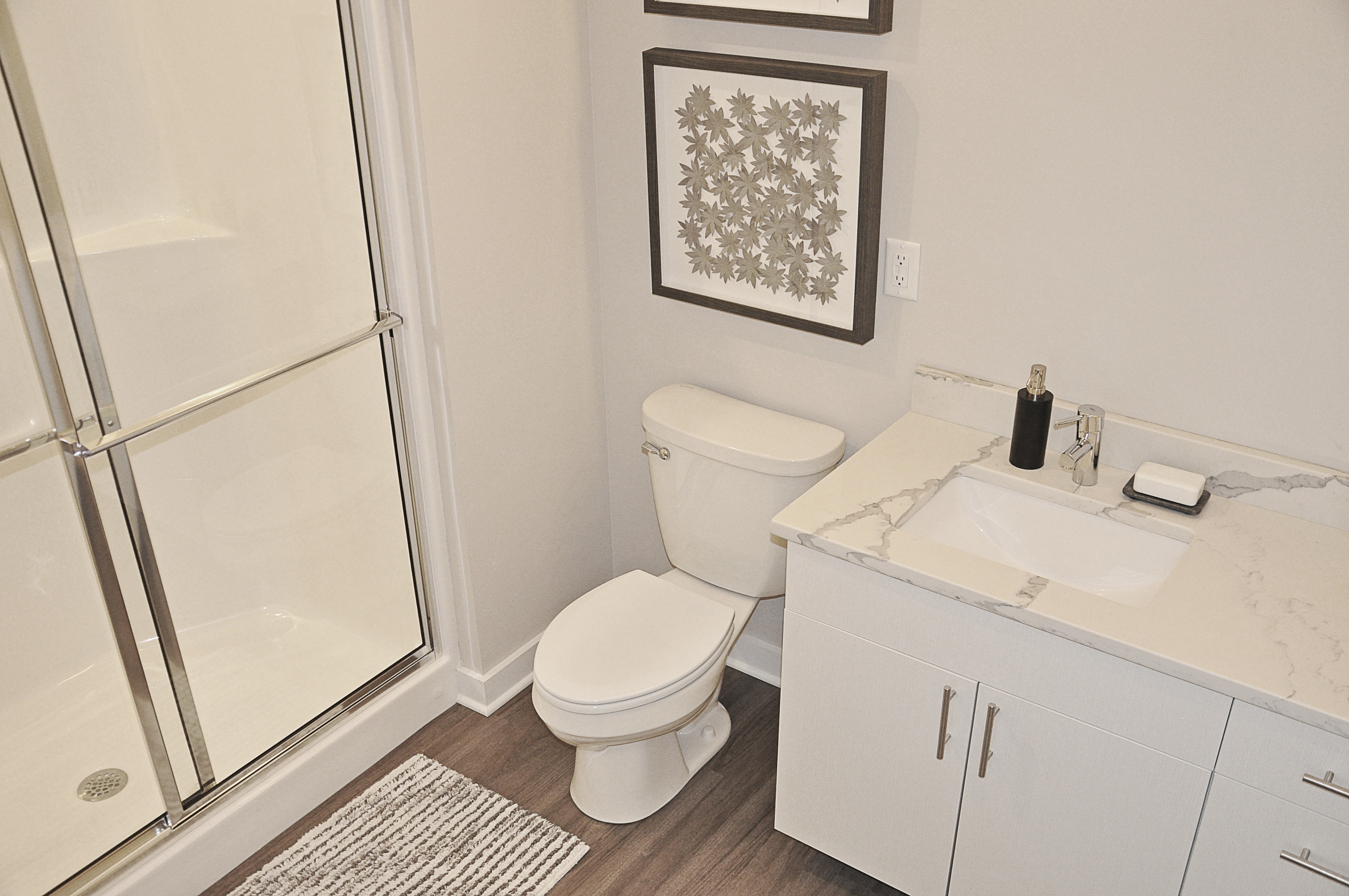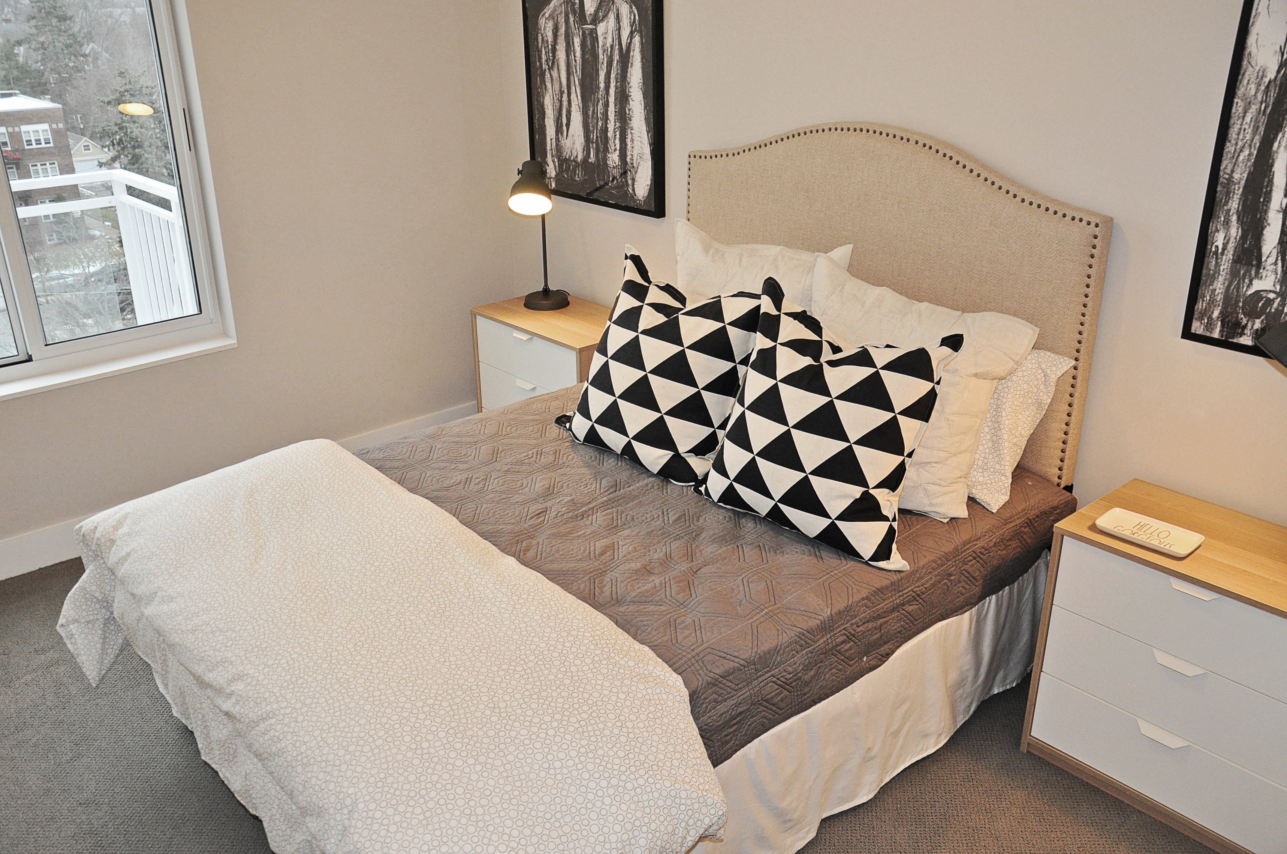 Contour on Prospect - Plan HJ This one bedroom apartment home features a southern exposure and phenomenal lake views on upper floors! A large, wrap-around style kitchen features stainless steel appliances, quartz countertops, ceramic tile backsplash, soft-close cabinetry, and under cabinet lighting. Beautiful pendant lighting illuminates this sleek and modern kitchen. The bedroom closet features double hanging rods to maximize storage space. A large south-facing balcony with floor to ceiling windows lets in great light all day long. Tall 10-foot ceilings make the space feel even brighter and bigger! A convenient utility room is home to a full-size washer/dryer, coat closet and extra storage space. Come tour your new apartment home today!