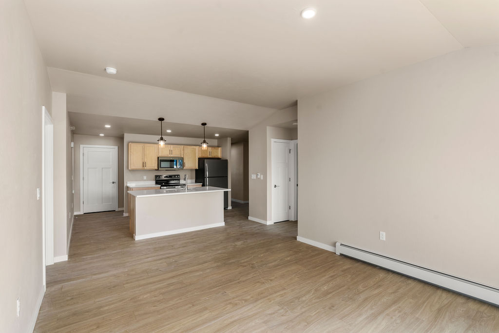 Discover modern living in this beautifully renovated 2-bedroom, 2-bathroom house, offering 1,446 square feet of contemporary comfort in Johnson Creek. Step inside to an expansive open-concept layout, where durable light wood-look LVP flooring flows seamlessly through sunlit living areas. The heart of this home is undoubtedly the chef's kitchen, featuring light wood shaker cabinetry, pristine light quartz countertops, and a spacious island with seating perfect for entertaining or casual meals. Stainless steel appliances, including a sleek black refrigerator, and modern pendant lighting complete this inviting space. Retreat to bedrooms finished with plush gray carpeting, offering a cozy sanctuary. Both bathrooms boast updated light wood shaker vanities with integrated sinks, chrome fixtures, and bright, clean finishes. Enjoy the convenience of an in-unit stackable washer and dryer, ample storage solutions, and a private entrance. Additional amenities include an attached garage and a charming balcony, perfect for enjoying a breath of fresh air. Cats and dogs are welcome, making this a truly ideal home for all.