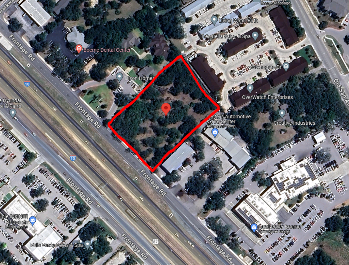 Ground Lease on I-10 Great Ground Lease Opportunity with Nearly 250 FT of I-10 W Frontage in Boerne. Flat, Wooded 2.1-Acre Lot with Serviceable Existing Structure that Could Serve as Small Office or Showroom. Zoned C-4 and listed at $40,000/Acre/Year. Fantastic Visibility, High-Traffic Count, & Surrounded by Established Businesses. Owner will Consider Subdividing Lot, Call Broker for Details.
