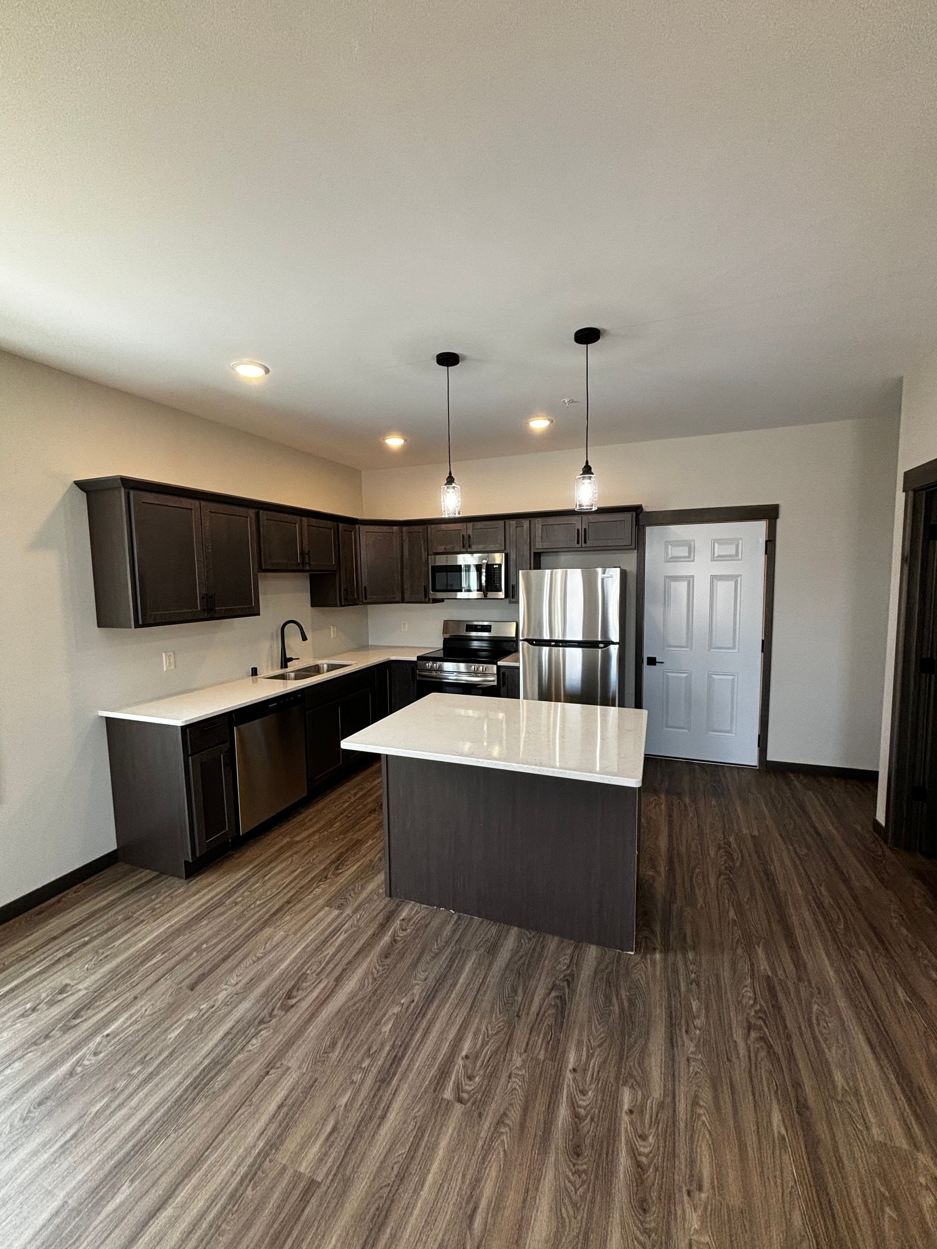 Discover unparalleled modern living in this brand-new, sophisticated 1-bedroom home. Step inside to an inviting open-concept space, where sleek dark wood shaker cabinets, pristine white quartz countertops, and