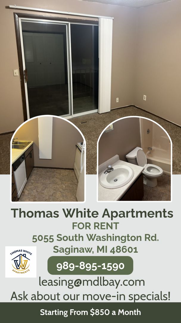 2 Bedroom Apartment $850 Remodeled Apartment- Thomas White Apartments Newly remodeled unit with fresh finishes and extra storage — move-in ready and close to Saginaw’s vibrant riverfront and downtown amenities. Vinyl plank flooring throughout living areas New carpet in bedroom(s) Fresh neutral paint, new vanity mirror & updated lighting Newer kitchen appliances Washer/dryer available in the shared basement Additional private storage available in the building basement Bright windows, updated fixtures, low-maintenance finishes Rent: $850/month (water, sewer, trash included) Tenant pays: Electric/Gas We welcome cats and small dogs (with breed restrictions) for an additional fee, so your furry friends can feel right at home, too. Experience hassle-free move-in with our exclusive Spectrum Onboarding service! Get fast, reliable internet and cable services at a discounted rate additional to your monthly rent. This service is required at this community. Renters insurance is required or can be provided at a low monthly cost. Contact us today for more information and to schedule your tour! Rentmdl.com (989)895-1590 Ask us about our Security Deposit alternatives available to lower move in costs Rental Terms: Rent: $850 Application Fee: $50 Available Now Pet Policy: Cats allowed Dogs allowed Utilities Included: Water Trash