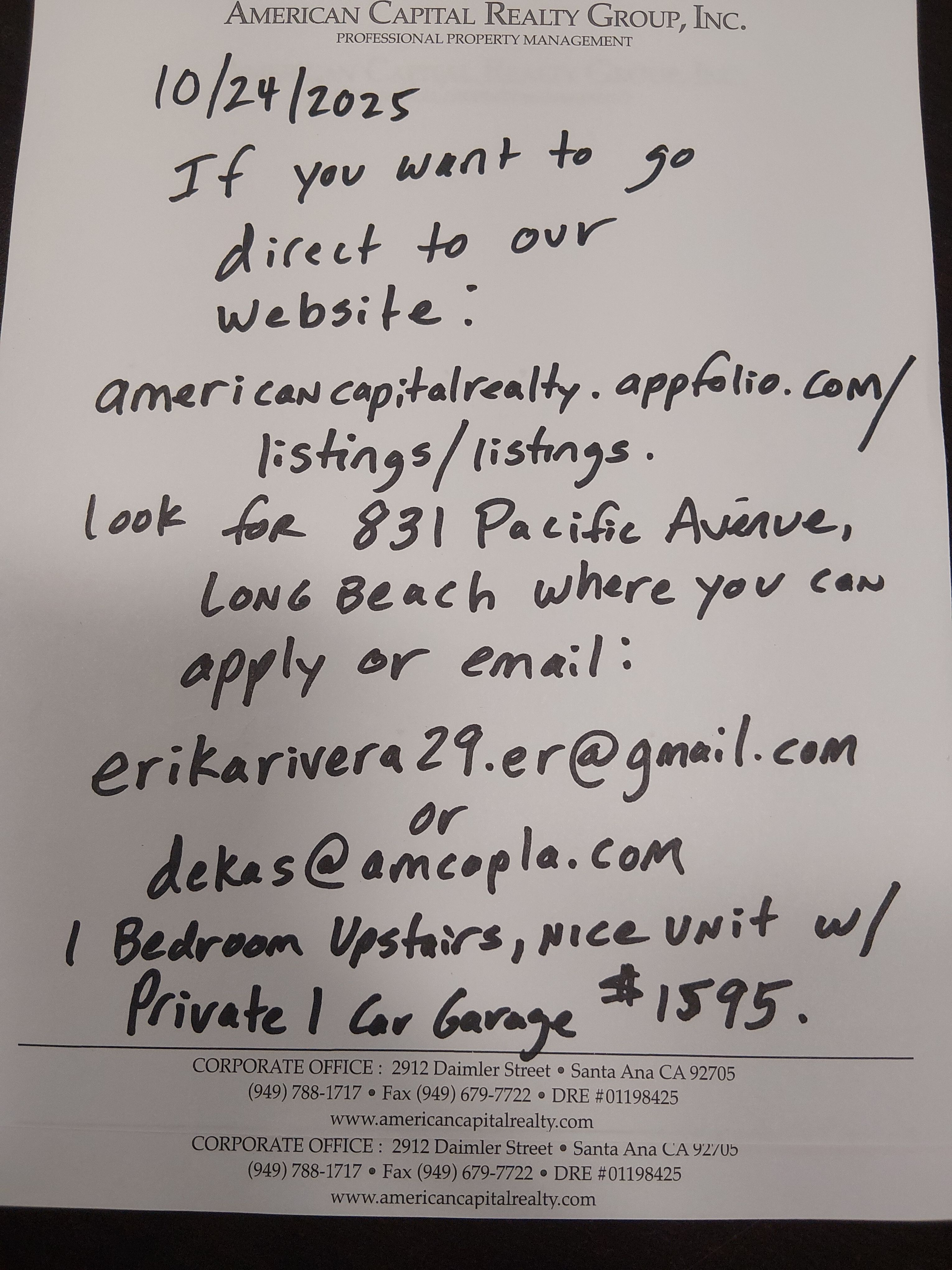 Newly Available! If Interested Email the Leasing Assistant Erika at: erikarivera29.er@gmail.com or Derek dekas@amcapla.com, also we will receive a large volume of emails and will return those in the order received until we have the unit rented. Please do not contact our Corporate office, as this rental is being handled and all activity by one of our Managers out of Downey. The Leasing Assistant is a part time employee, and will only work limited hours on this rental. The property is a smaller complex in a Residential Neighborhood real close to Transportation and shopping. Just to the northwest of the Downtown Pine Avenue Area and the Mall. This is a smaller property of 9 units in the front, and this unit is in the back separate building with 3 units. Unique layout Upstairs 1- Bedroom 1-Full Bath, full sized Bathtub 1-Car Garage Good sized Kitchen with room for smaller dining room table and great cabinet space. Newer flooring throughout Closet space. Gas Range Blinds $1595 Monthly Rent $1200 Security Deposit (OAC) $500 Off First Month's Rent (OAC) We do have a requirement for Liability Renters insurance, either proof of a policy or a monthly payment of $15 can be made to meet this requirement. Pets- Only one Indoor Only Small Pet Dog (no dangerous breeds) or Indoor Pet Cat allowed, Additional $250 Pet Deposit required. And will consider other types of Pets such as contained in a Cage, Tank, Aquarium, a deposit could be charged with a limit of a 5 gallons size only allowed. We usually semi- remodel any newly vacated unit by Freshly Painting and the Units are Freshly Cleaned. The pictures posted are of the actual unit near completion! This current unit needs to be photographed and is prepared nicer than the photos shown. Utilities- The Tenant pays Electric, Gas, and Trash and the Owner pays Water, and Gardening on the common grounds. The tenant would have to check on the availability of Cable or Internet Services and for Satellite Dishes we do have certain Rules and Restrictions. For this 1-bedroom, we will take up to a maximum of 3 people. The application processing fee is $40 per adult. Each adult interested will have to complete an application. We will only take certified funds for the application processing fee (cashier's check or money order or cash, no personal checks). Application Processing Fees are not refundable. The maximum hold with a full deposit paid, is 10 days to Commencement a move-in. Directions- Pacific runs North South and is located just south of West 9th Street. The Property is Professionally Managed by American Capital Realty Group, Inc. (AMCAP) in Santa Ana near Irvine, California Prices are subject to change, based on availability and unit improvements.