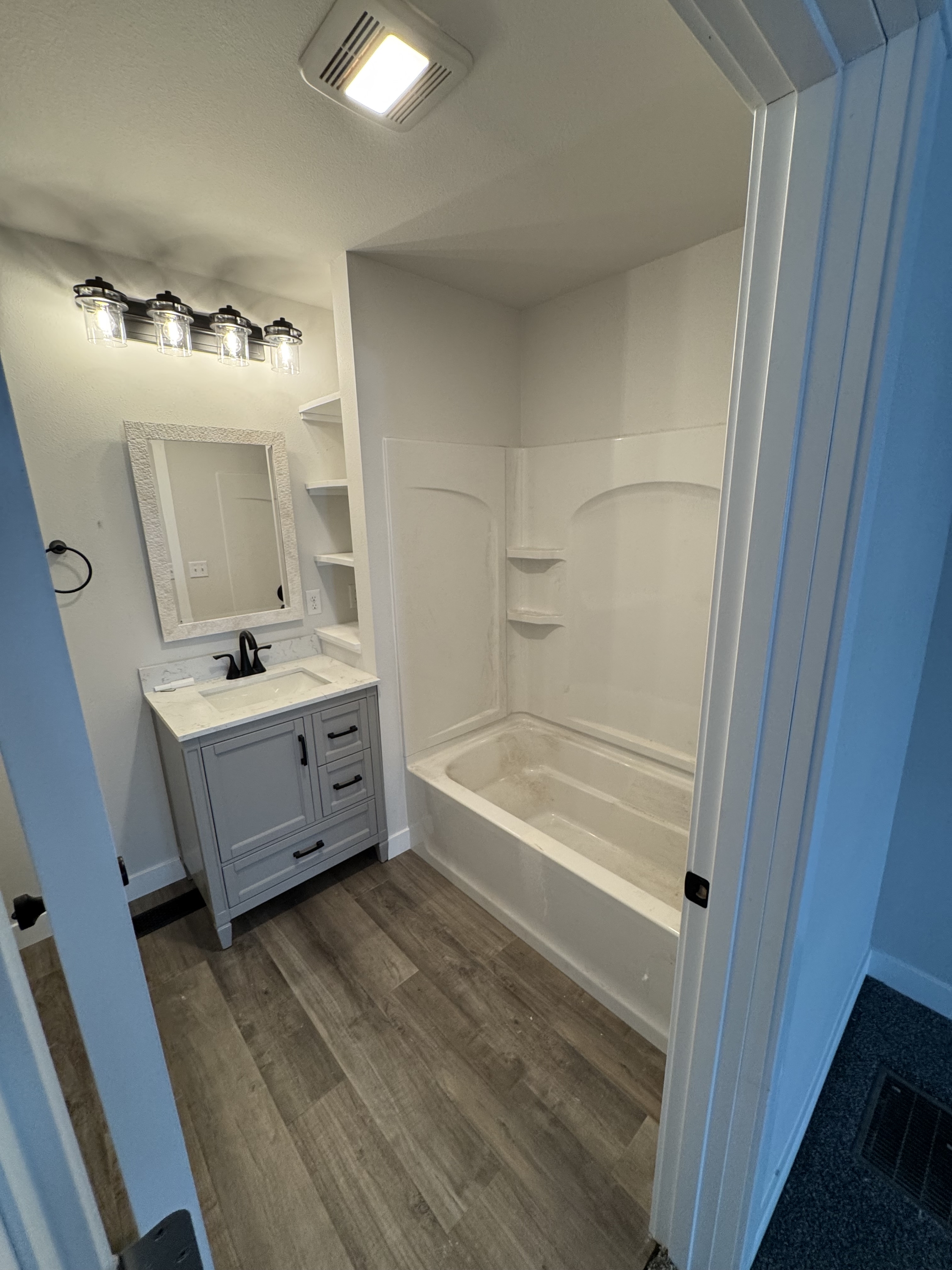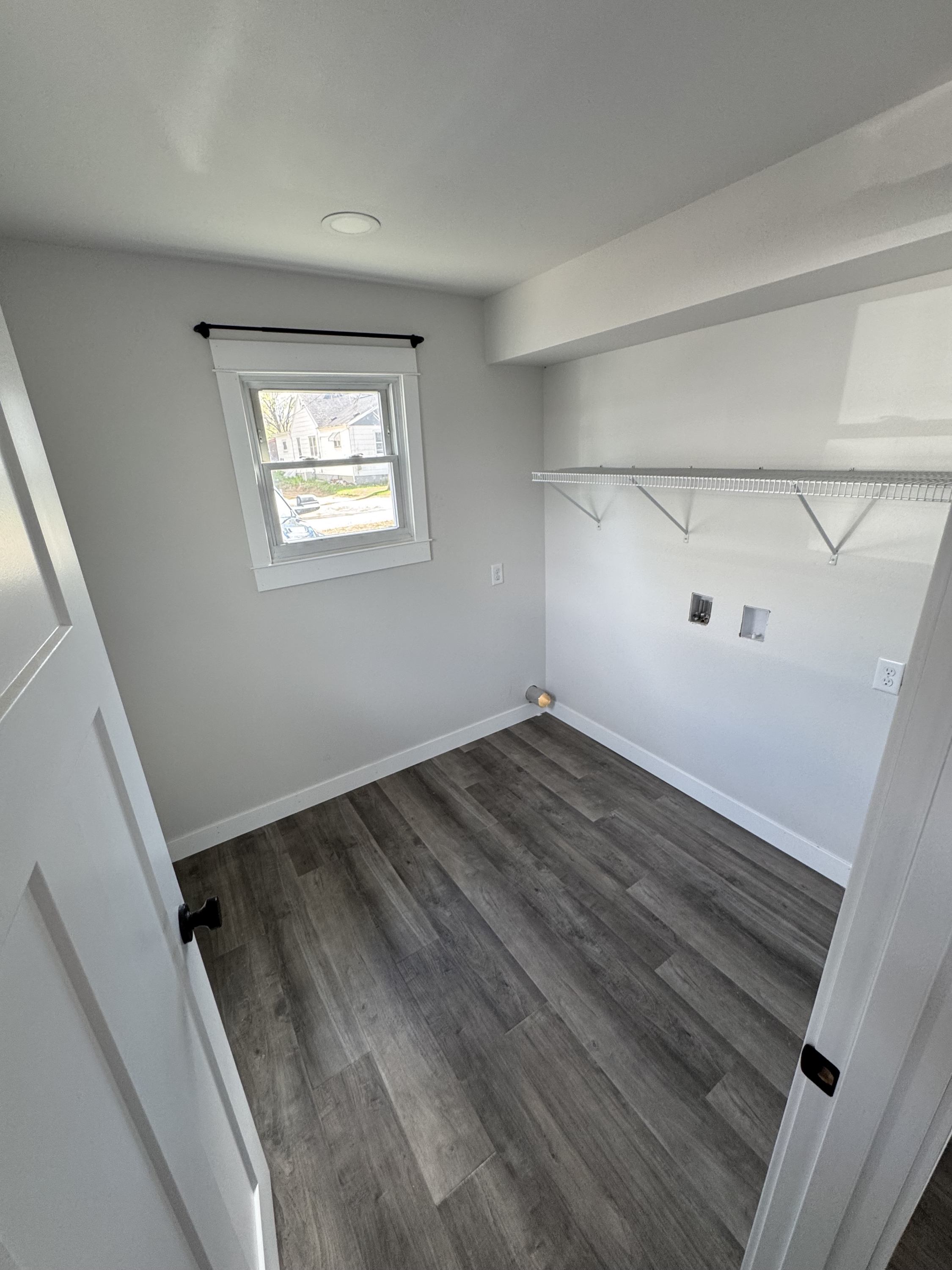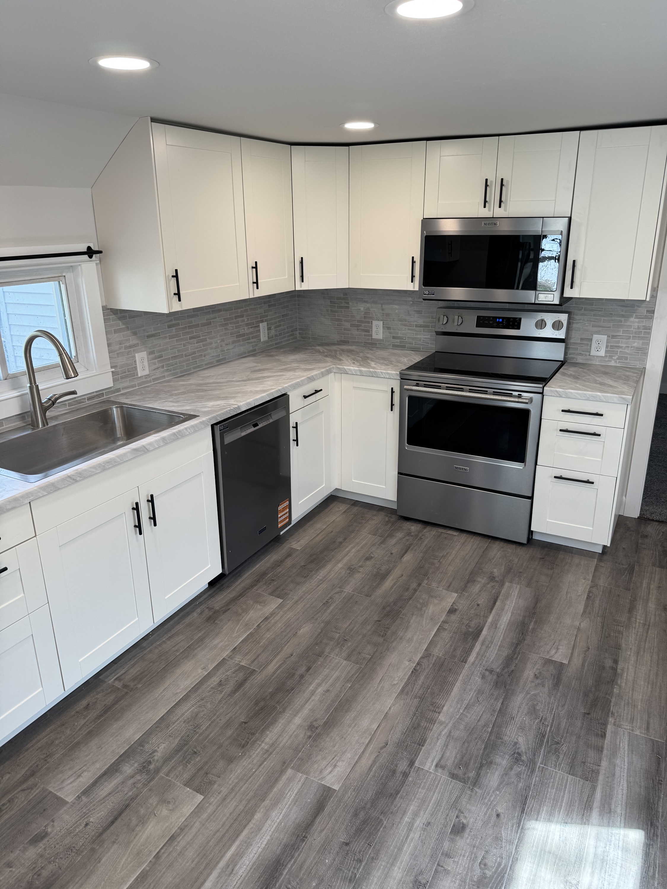 Discover the modern transformation of this charming 2-bedroom, 1-bathroom home on Lakeside Avenue, offering a bright and inviting living experience. Step inside to an open-concept layout bathed in abundant natural light from multiple windows, highlighting the sleek grey luxury vinyl plank flooring and plush grey carpeting. Freshly painted light grey walls, crisp white trim, and contemporary black hardware create a sophisticated backdrop for your personal style. The gourmet-inspired kitchen is a true delight, featuring pristine white shaker cabinets, elegant grey subway tile backsplash, and gleaming stainless steel appliances including a refrigerator with water and ice dispenser. Ample counter space and recessed lighting make meal preparation a joy. The spa-like bathroom boasts a modern grey shaker vanity with a sleek black faucet, a white solid surface countertop, and convenient built-in shelving, complemented by stylish wood-look flooring. Outside, a well-maintained white vinyl exterior, neatly kept front yard, and mature trees provide a serene setting. Enjoy the convenience of a detached two-car garage, offering ample parking and storage. This meticulously updated home offers comfort, style, and practicality, ready for you to enjoy.