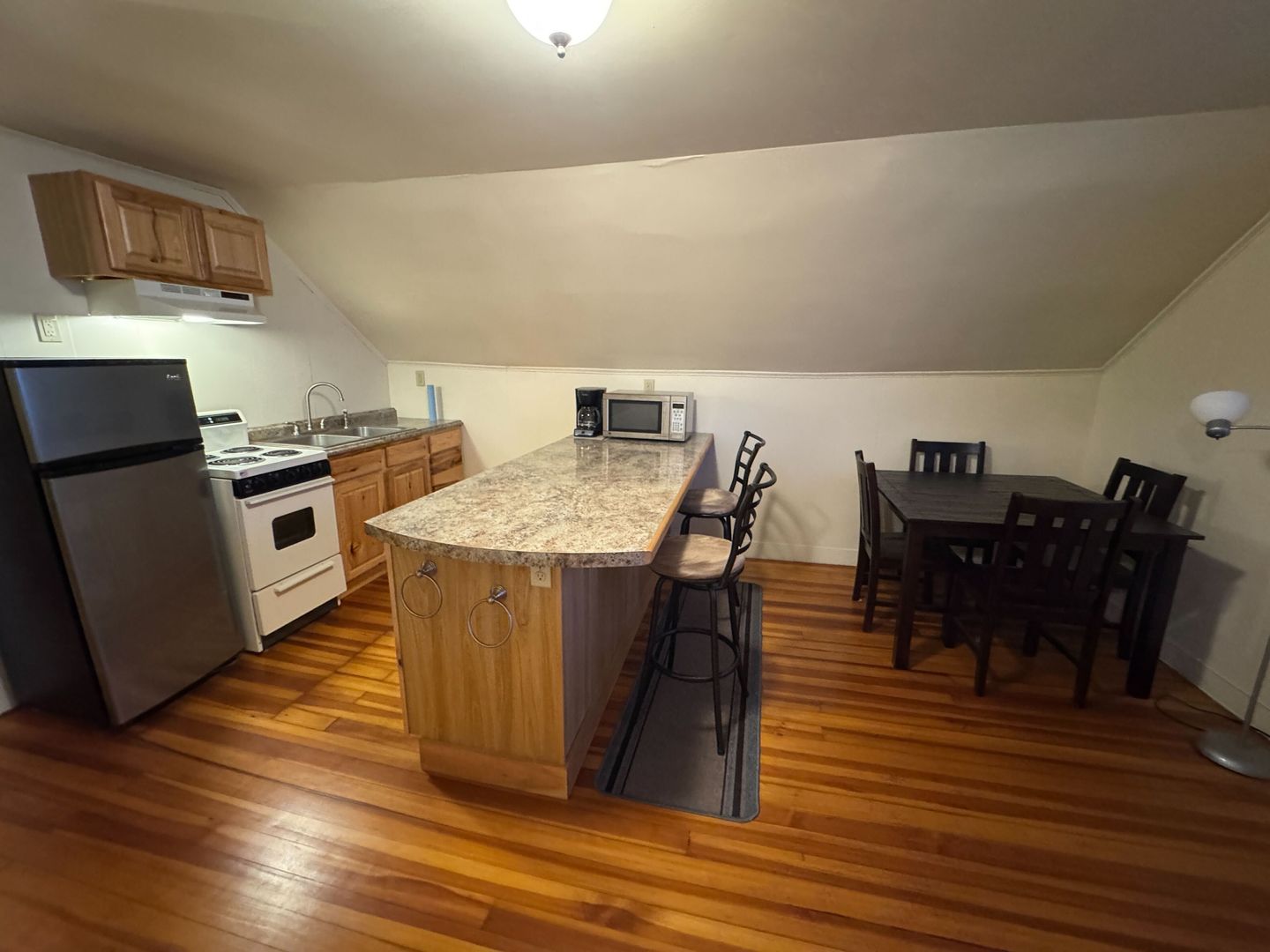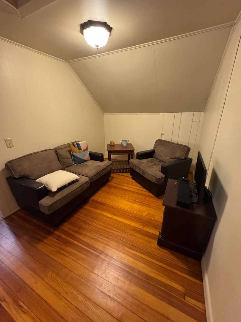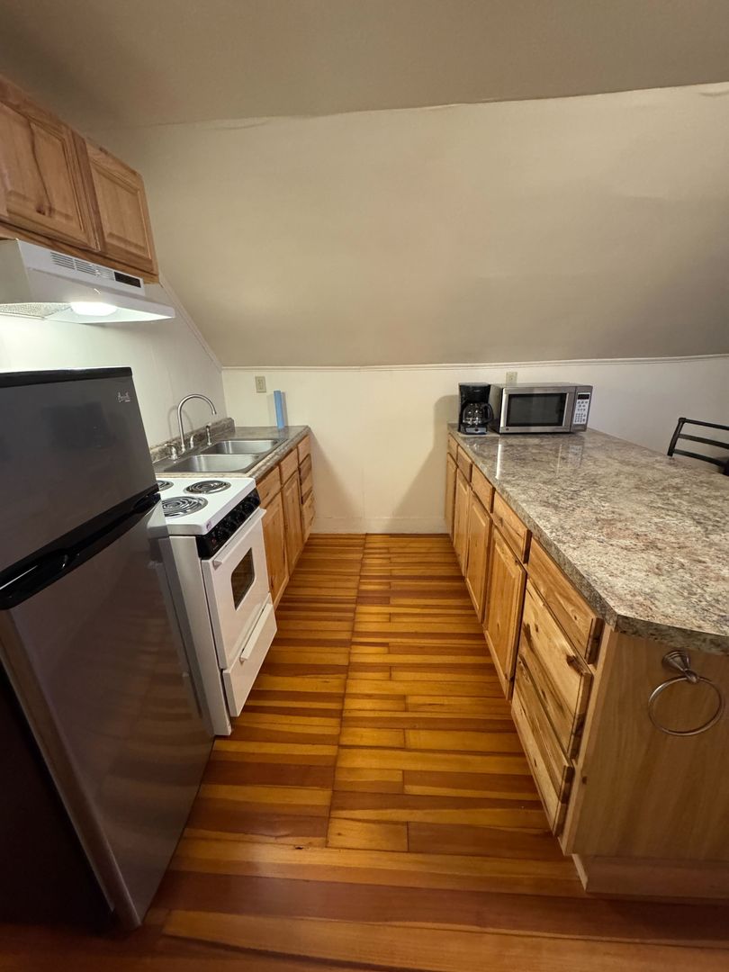 Furnished Top Floor Unit-Flexible Lease Terms Furnished one bedroom top floor unit with charming finishes-Available Now This unit is ideal for someone looking for a short or long term stay with furnishings provided, just move right in with out the hassle of hauling furniture! When you enter the unit into the living area from the private stairway there is a small sofa, chair, television and it also has an adjacent landing giving the compact space a more open feel. The kitchen is nicely appointed with natural wood finished cabinetry, appliances, a breakfast bar, a dining table and beautiful hardwood floors which run throughout the unit. The only bedroom has space to move around with a bed, nightstands and bureau provided for use. The bathroom has a standing shower only. Included Utilities & Services: • Heating fuel • Hot Water •Water/Sewer •Trash Removal Rental Terms: • Positive rental and employment references are required. • 12-Month Lease • Security Deposit and First Month's Rent due by move-in • No smoking • No pets • Additional admin and tech fees may apply. Get in touch today to set up a viewing- this unit won't last long!