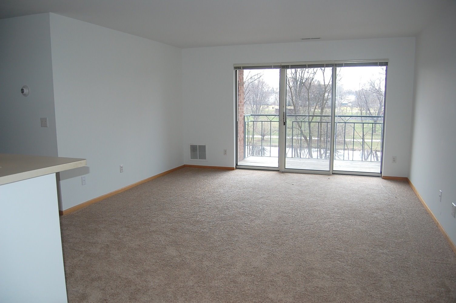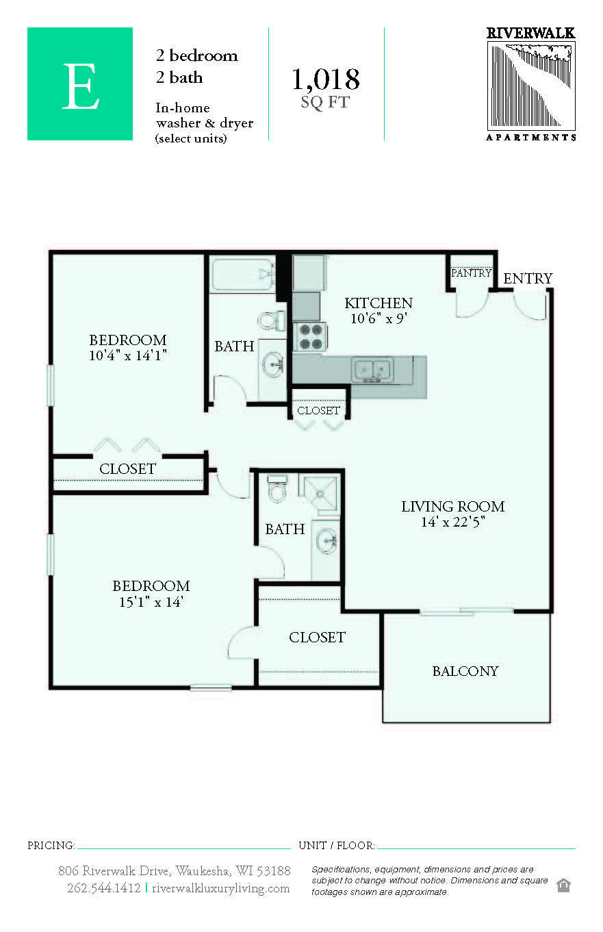 Spacious two bedroom, two bathroom near Downtown Waukesha! This 2-bedroom/2-bathroom apartment home is a beautiful corner residence with fantastic storage space! Floor Plan E features a spacious layout with an open kitchen and breakfast bar that makes cooking and entertaining a breeze. The adjoining living room is an impressive 14 x 22 feet, offering plenty of room for a dining table or home office set-up! The storage space in this apartment home is sure to impress: a fantastic walk-in closet in the master bedroom, coat closet near the front door, pantry/linen closet in the main living space, and over-sized wall closet in the secondary bedroom. The master bedroom is incredibly spacious, with plenty of room for a king-size bed. The master also features a spacious full bathroom and phenomenal walk-in closet. A large balcony with floor to ceiling glass sliding doors is located off the living room! Plenty of windows to let in lots of light and amazing river views!